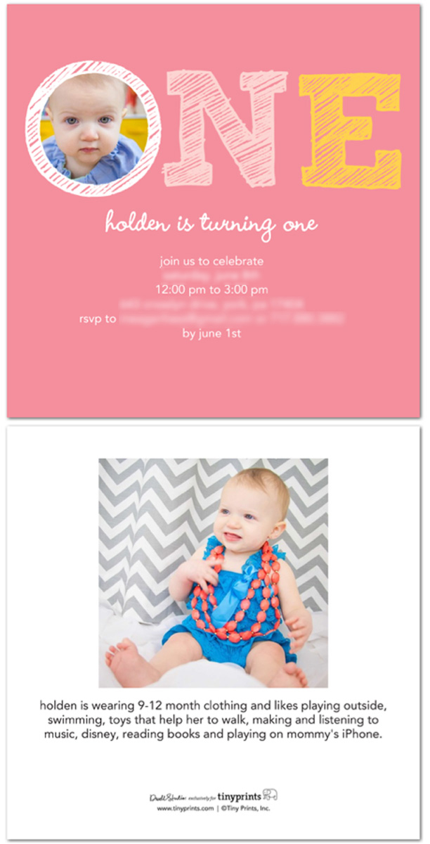 I went the Tiny Prints route because I find them and Shutterfly to be the most stress-free for invite (and announcement, Christmas cards, etc.) shopping.