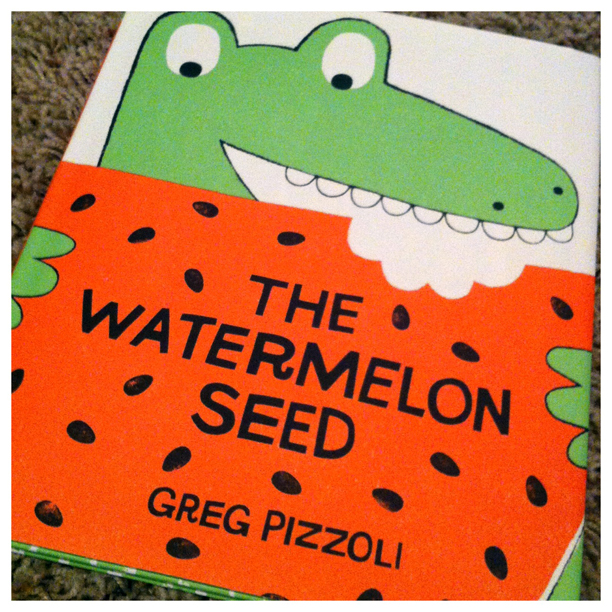 Holden got an early birthday present this week that I am absolutely in love with. It’s a children’s book called The Watermelon Seed by Greg Pizzoli, a writer and illustrator who, it turns out, is from my hometown!