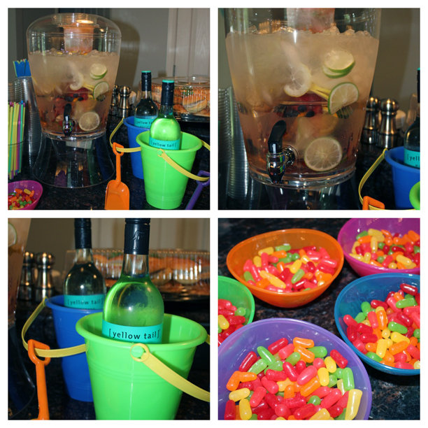 I added fruit of all colors to my beverage dispenser to make “Rainbow Water” (that tasted awesome, btw). Sand buckets made great impromptu wine buckets!
