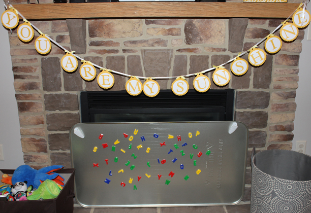 Most of the boards I’ve seen on Pinterest were hung vertically, but with Holdy being so little (and having a tendency to pull on stuff), we decided to mount it horizontally. We put it in front of the fireplace because, well, it was the only adequate amount of “wall space” we had, and we never use the fireplace anyway because the glass gets too hot for baby hands.