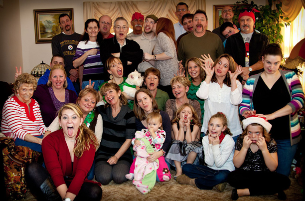 My family, 30 of us strong (and growing), gather for a potluck, baked macaroni and cheese, hamburger BBQ and a special green sherbet punch. We do gifts for the small kids and Pollyannas for the big kids, and tons of fun raffles (including jars of pickles). It’s been my favorite holiday tradition for, well, ever.