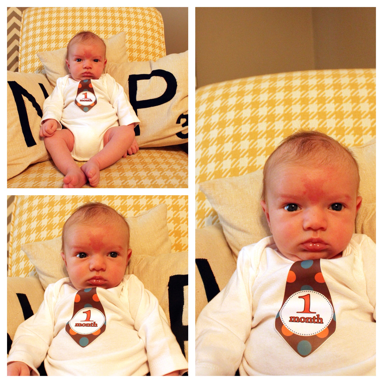Because I really boned up Holden’s monthly photos by not showing her sitting in a chair or something to give perspective, I’m going to try a bit harder this time around. The adorable month tie stickers are from Bump2Baby Stickers on Etsy.