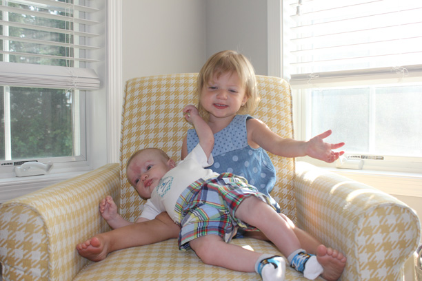 Likes: being held, milk, his sister, sitting outside, watching the fan, watching mommy, when mommy makes crazy faces and voices, the baby gym, “boots and pants and boots and pants and boots and pants and boots and pants,” being “hugged” by his sister, flying in the air, being tickled