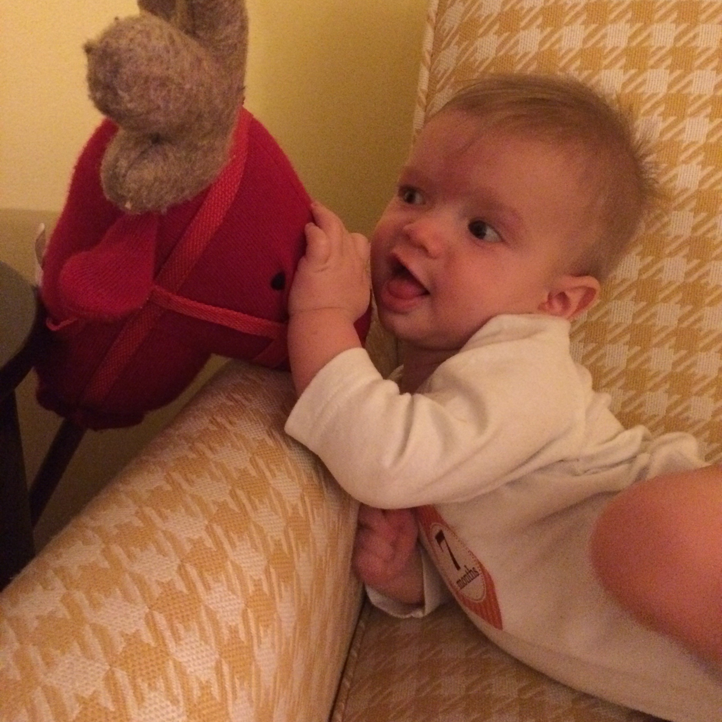 Accomplishments: He’s allllllmost sitting up unassisted. He talks a lot and has kind of said, “Dada” (grrr!). Smiling (a lot!), chuckling, rolling over like crazy, grabbing toys, kicking like a soccer player, putting his Nuk in his mouth.