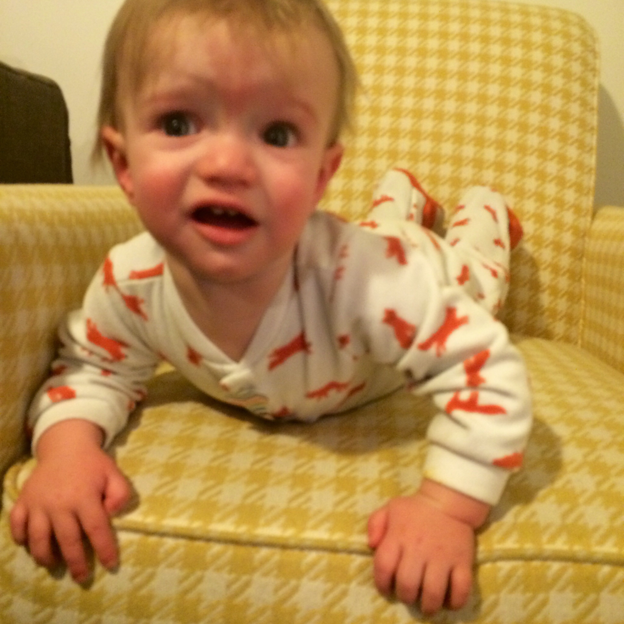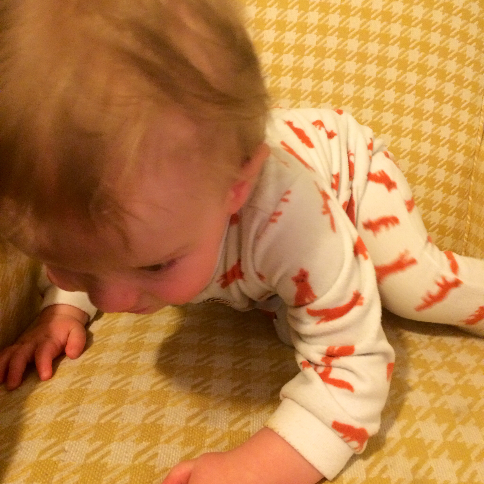 Likes: eating! open mouth kissing, army crawling, dancing to “Uptown Funk,” trying to stand up, rolling, being harassed by his sister, gnawing on Sally’s fur, stealing people’s food, bouncing in his bouncer, lights and noises, being held, his mama.