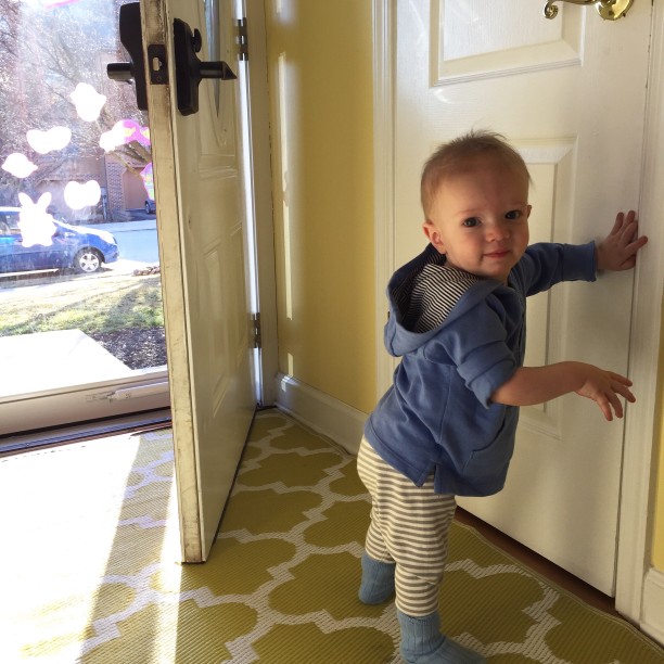 And oh boy, do you crawl. You climb the stairs like a champ all by yourself. You pull yourself up on everything. You’ve had a few tumbles into the coffee table… sorry about that. You’re strong and determined and persistent. Before you crawled, you rolled everywhere to get to your destination–I would watch you identify your target and then roll across the room to get there. You’re curious and investigative and full of joy. You’re obsessed with doors for some reason.