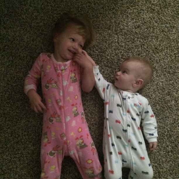 Oh man, do you love your sister. From very early on, you’ve only had eyes for her. You love to watch her and try to join in what she’s doing. You’ll both probably kill me later for saying this, but you guys love taking baths together. You shriek and laugh and splash, so much so that I usually end up as soaked as the two of you.