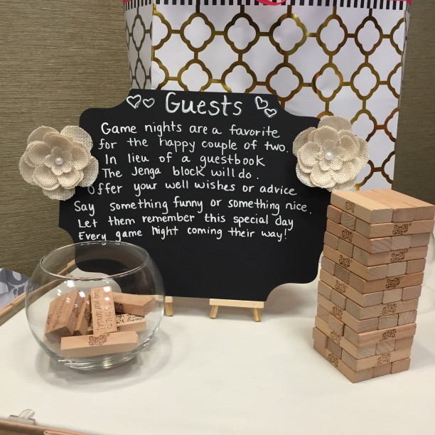 The bride and groom love hosting Game Nights so all guests signed Jenga Blocks with messages for the couple.