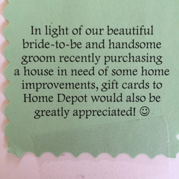 The shower invite also let guests know that home renovation gifts would be appreciated as the newlyweds work on their new home.