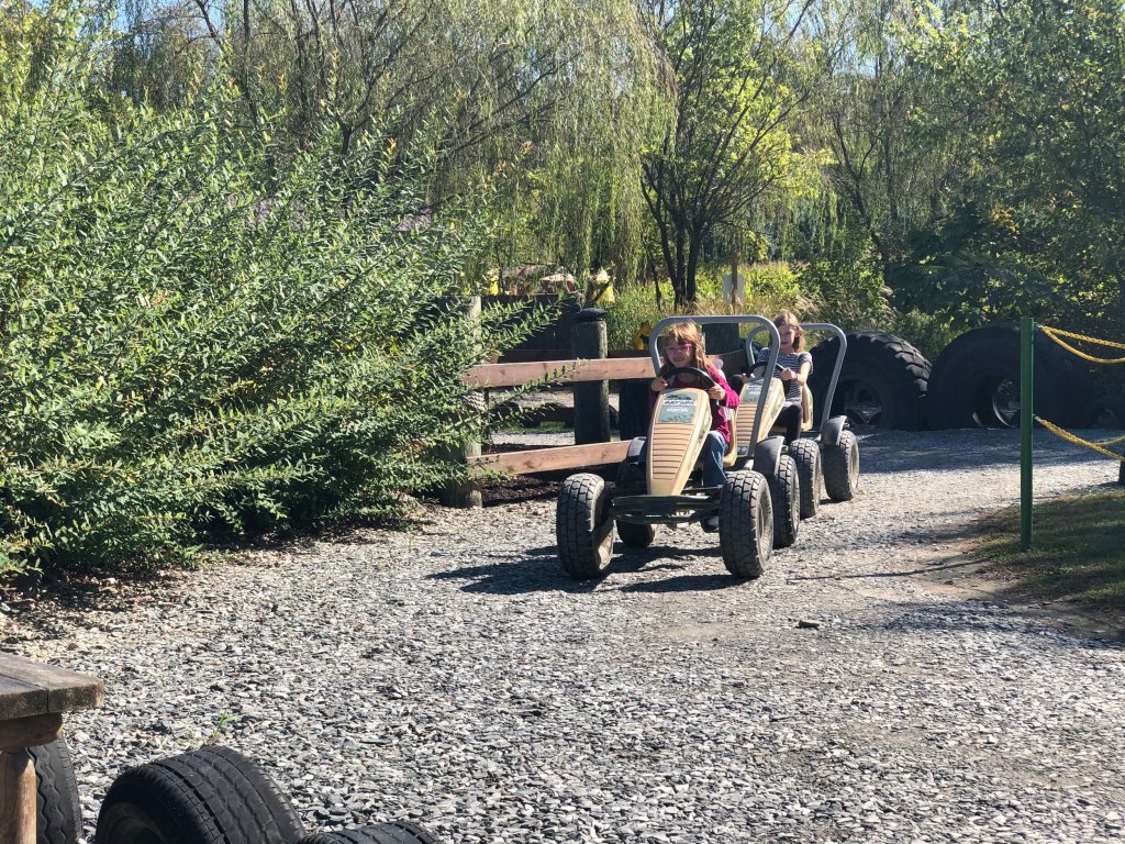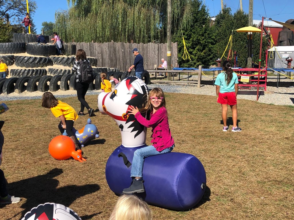 There is a TON of stuff to do: corn maze, tractor tire mountains, slides, tractor cart rides, a barrel train, hayride, an enormous bouncing pillow, playgrounds, corn kernel “sandbox,” tennis ball slingshots, games, pumpkin painting, bouncing pony hops, etc.
