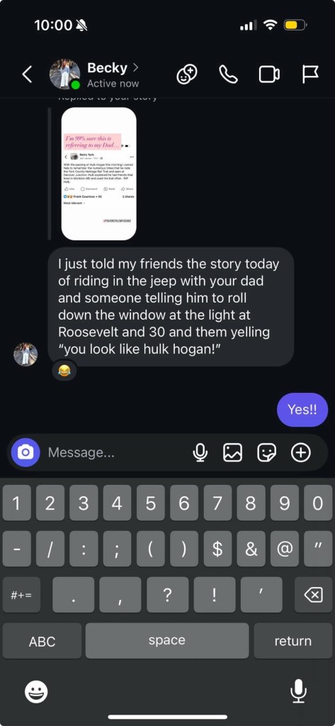 “I just told my friends the story today of riding in the jeep with your dad and someone telling him to roll down the window at the light at Roosevelt and 30—and them yelling ‘YOU LOOK LIKE HULK HOGAN!’”