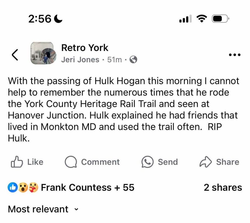 Correct. York County doesn’t do “quiet celebrity sightings.” If Terry Bollea had been biking through Hanover Junction, I feel like someone would have heard of it. Facebook searches show nothing, other than paid appearances at grocery stores.